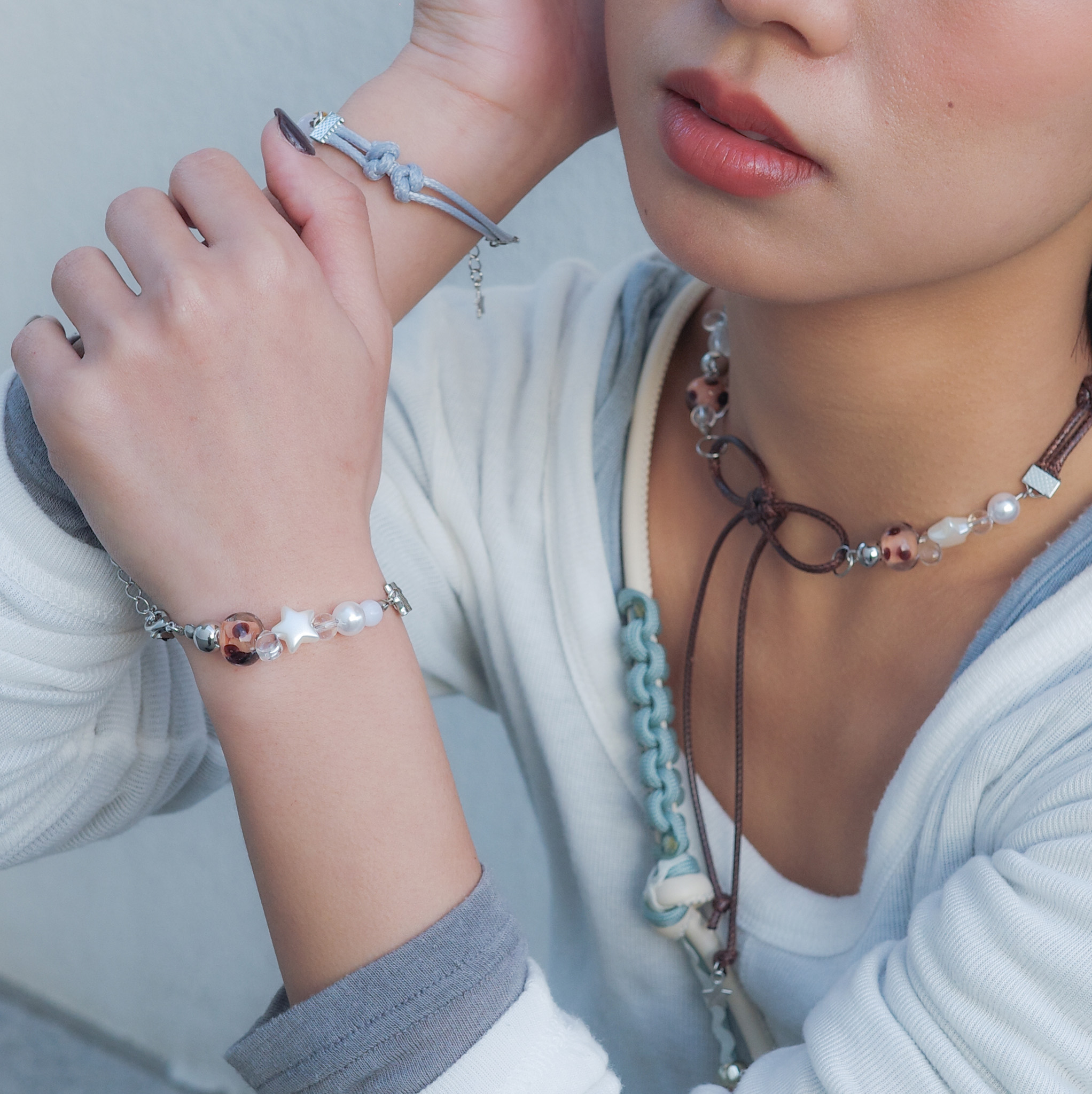 融合 中國繩結的蝴蝶結與 金蝶結細節, 搭配日系波點玻璃珠的清透質感, 在冬日光影中呈現一種柔霜般,靜謐卻耐看的風格。
