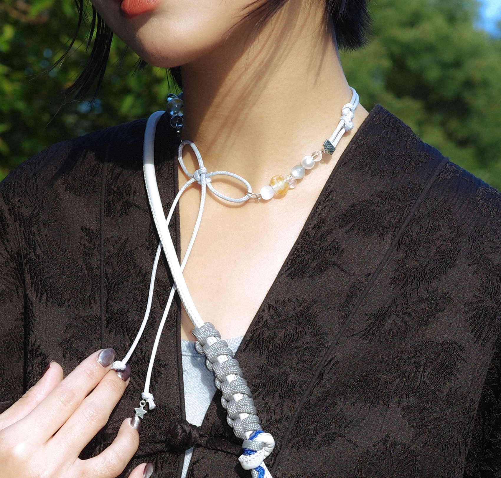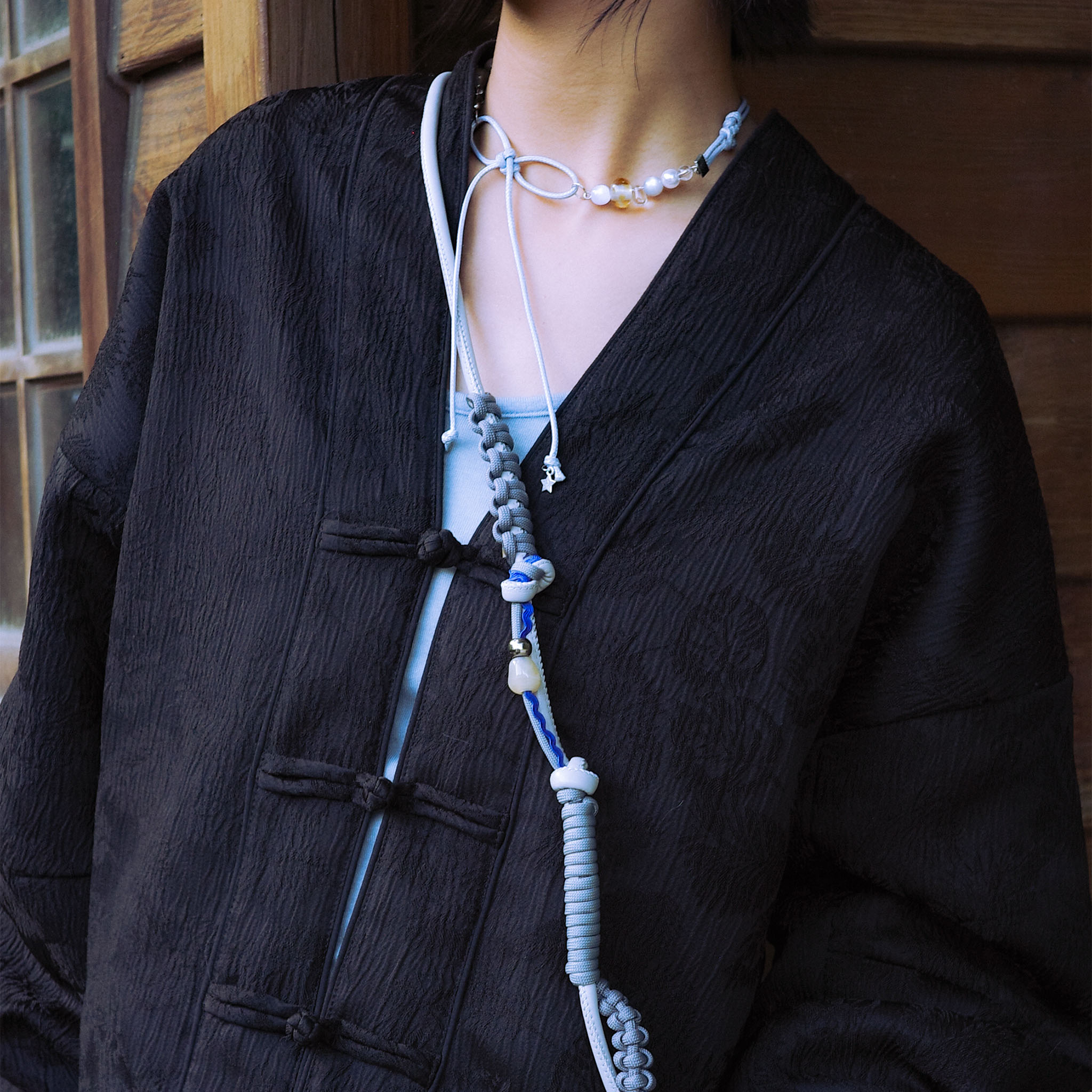 融合 中國繩結的蝴蝶結與 金蝶結細節, 搭配日系波點玻璃珠的清透質感, 在冬日光影中呈現一種柔霜般,靜謐卻耐看的風格。